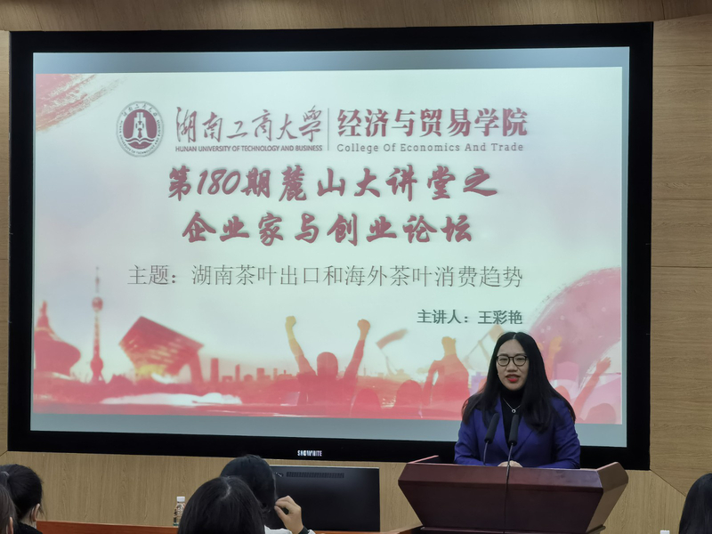 王彩艳校友毕业后就职于湖南省茶业集团股份有限公司,先后担任外销员、部门副经理、部门经理,现任集团公司副总经理。王彩艳校友就湖南茶叶出口和海外茶叶消费趋势进行介绍。在讲座中,她为大家分享了自己20年外贸工作的经验,通过自己多年的经历,向大家展示了如何成为一名合格的外贸人。同时,通过茶叶外贸环境困难的问题,王彩艳校友为大家解答了诸多疑惑。期间,同学们在她的点播下,积极思考,参与讨论,面对大家的问题,王彩艳校友耐心解答,为大家在未来贸易的道路上指点迷津。罗双临教授在大家的期待中也阐述了自己的观点进行总结。