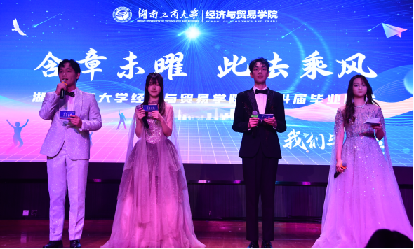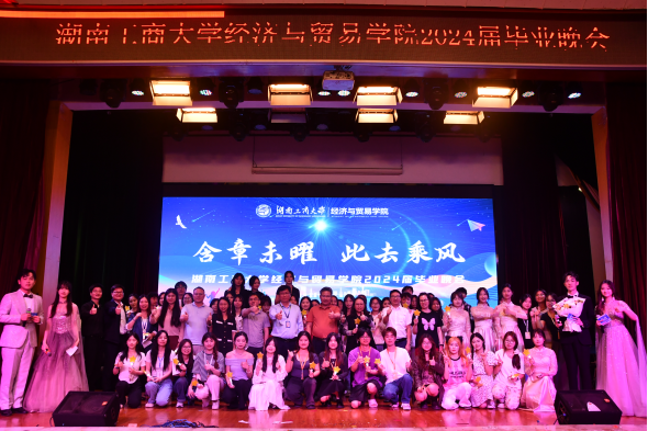 为欢送2024届毕业生,5月31日晚,经济与贸易学院在南校区楚枫活动中心成功举办“含章未曜,此去乘风”2024届毕业晚会。经济与贸易学院党委书记杨水根、院长向国成、跨境电商产业学院执行院长罗双临、党委副书记曾倩、副院长侯向群、副院长李建军以及全体辅导员老师、教师代表出席,2024届毕业生和各年级学生代表参加。高镇恺、花梦娟、姜昆、运晓钰四位同学担任主持人。