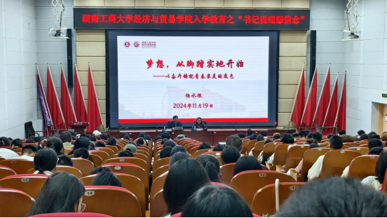 11月19日下午,经济与贸易学院在北校区图书馆报告厅开展入学教育之“书记说理想信念”专题讲座。学院党委书记杨水根教授主讲,党委副书记曾倩老师主持。辅导员傅凌志、李贺鑫老师和2024级全体同学参加。