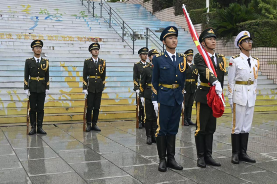 仪仗队迈着铿锵有力的步伐护送国旗入场,身姿挺拔尽显昂扬风貌。在雄壮的国歌声中,五星红旗冉冉升起,全体师生肃立行注目礼,目光追随着鲜红的旗帜,心中涌动着对祖国的无限崇敬与热爱。